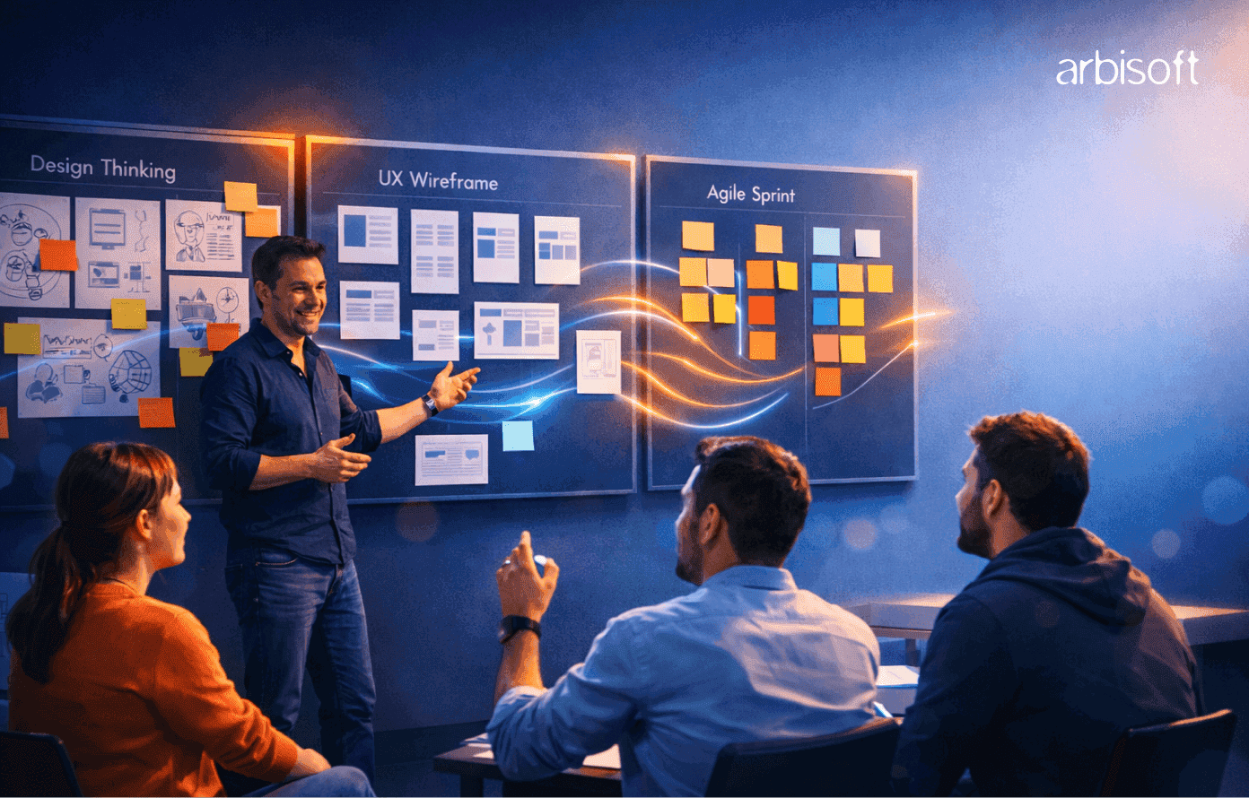 Design Thinking does not replace Agile. Instead, it helps guide it by ensuring the team is focused on the right challenge from the start.