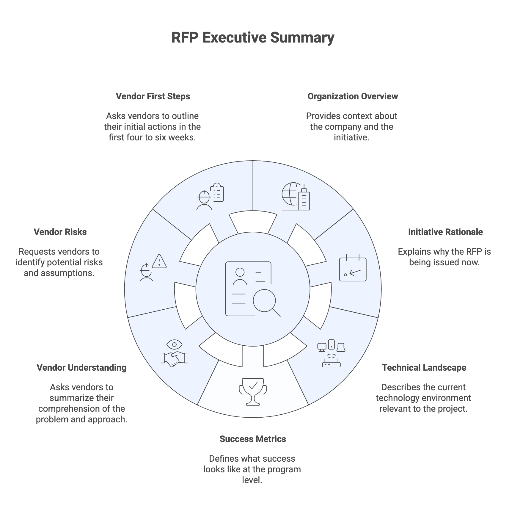 - Decision timeline: RFP dates, Q&A window, proposal deadline, evaluation window, finalist activities, and whether you plan a BAFO process.