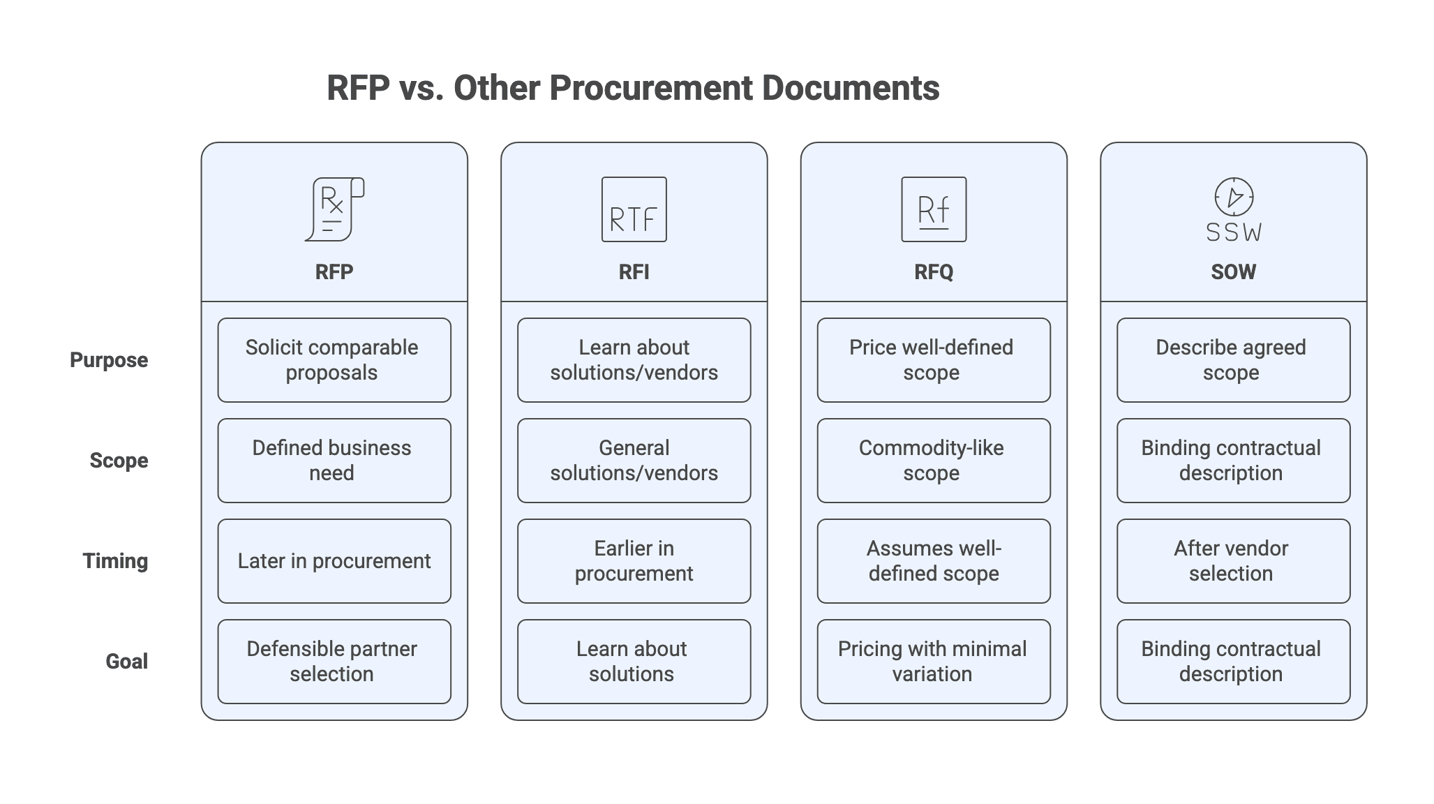 - A Request for Information (RFI), which is typically shorter and used earlier to learn what solutions or vendors exist.