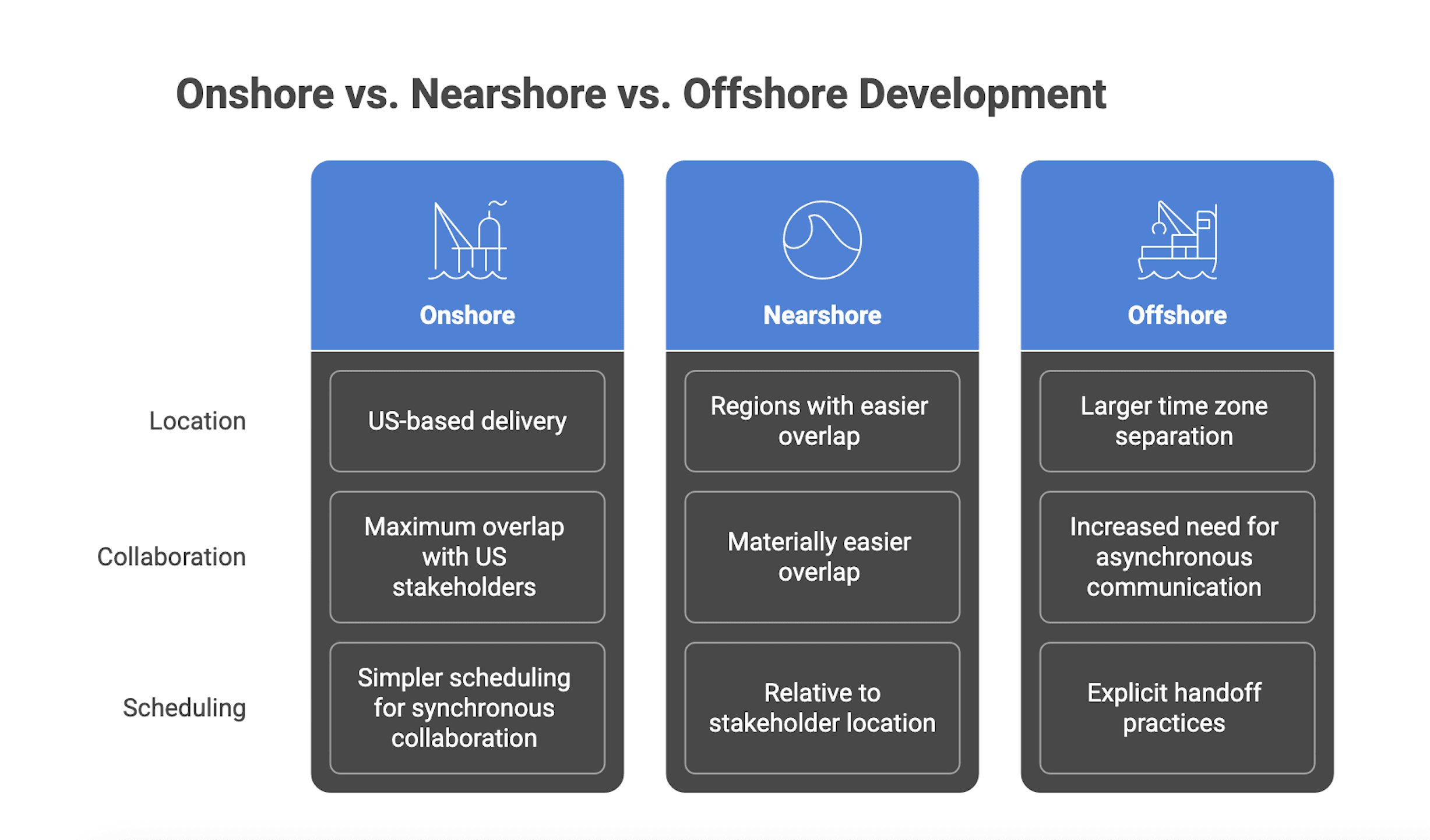 Dimension | Onshore (US-based) | Nearshore | Offshore |