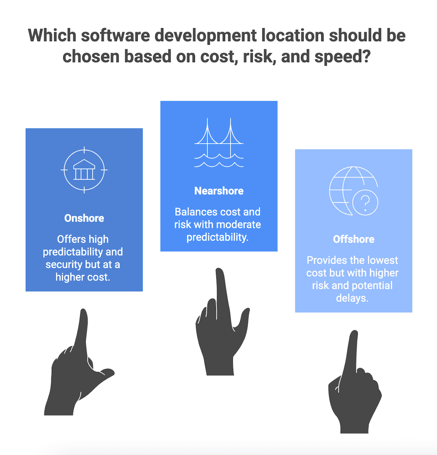 There is no universal best geography model. Onshore, nearshore, and offshore are different ways of buying overlap, logistics, and cost structure. Outcomes depend heavily on governance and vendor maturity.