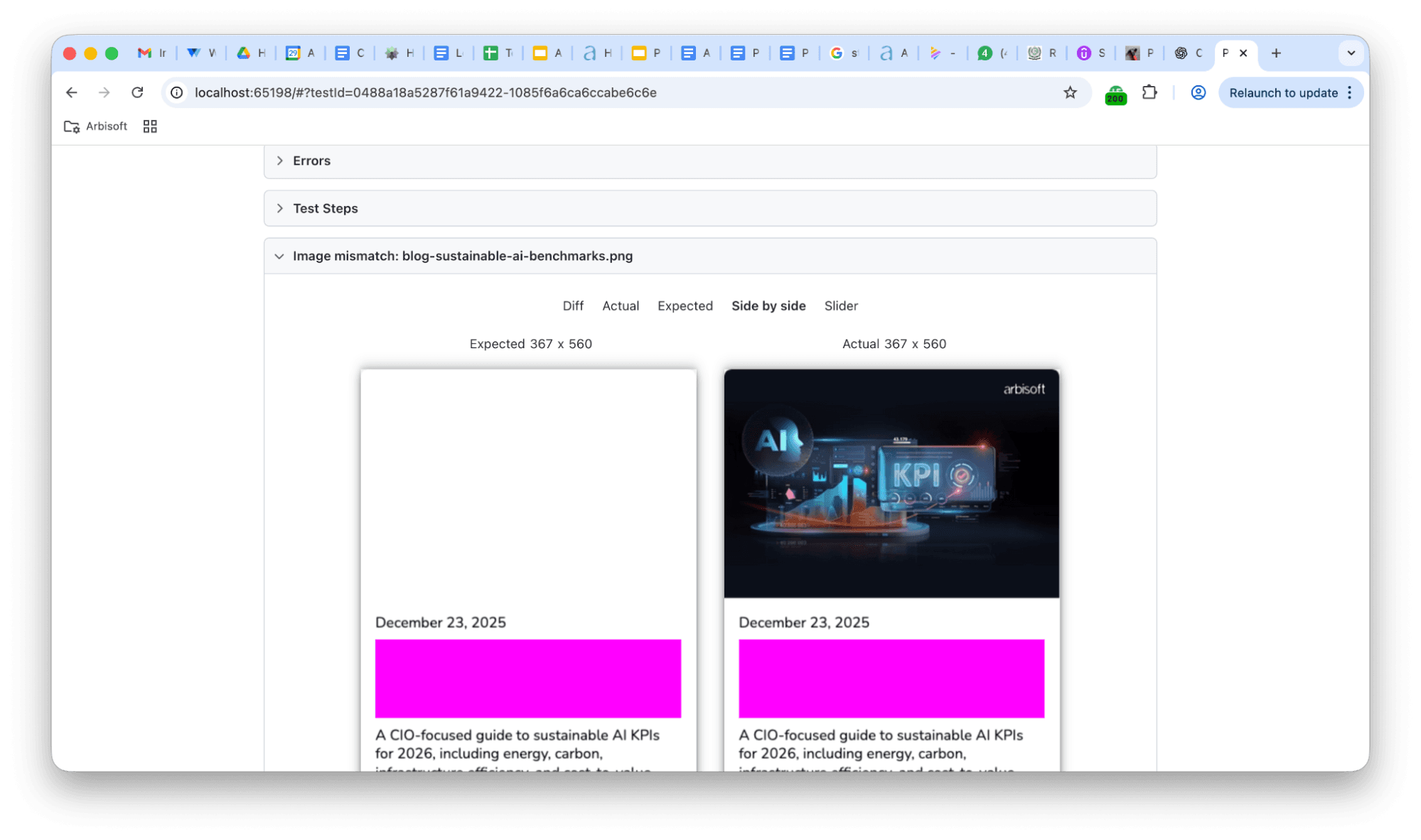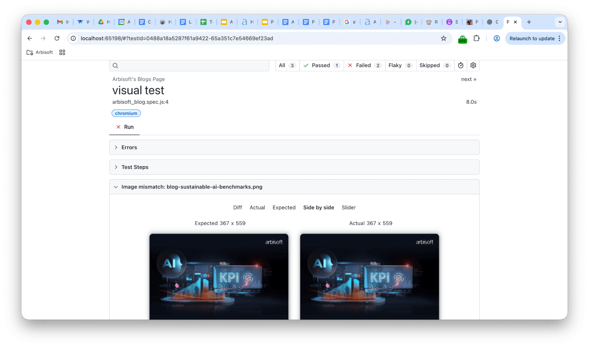 We have errors in the terminal. This is actually expected in visual testing. If you look at the report, Playwright is comparing screenshots pixel by pixel.