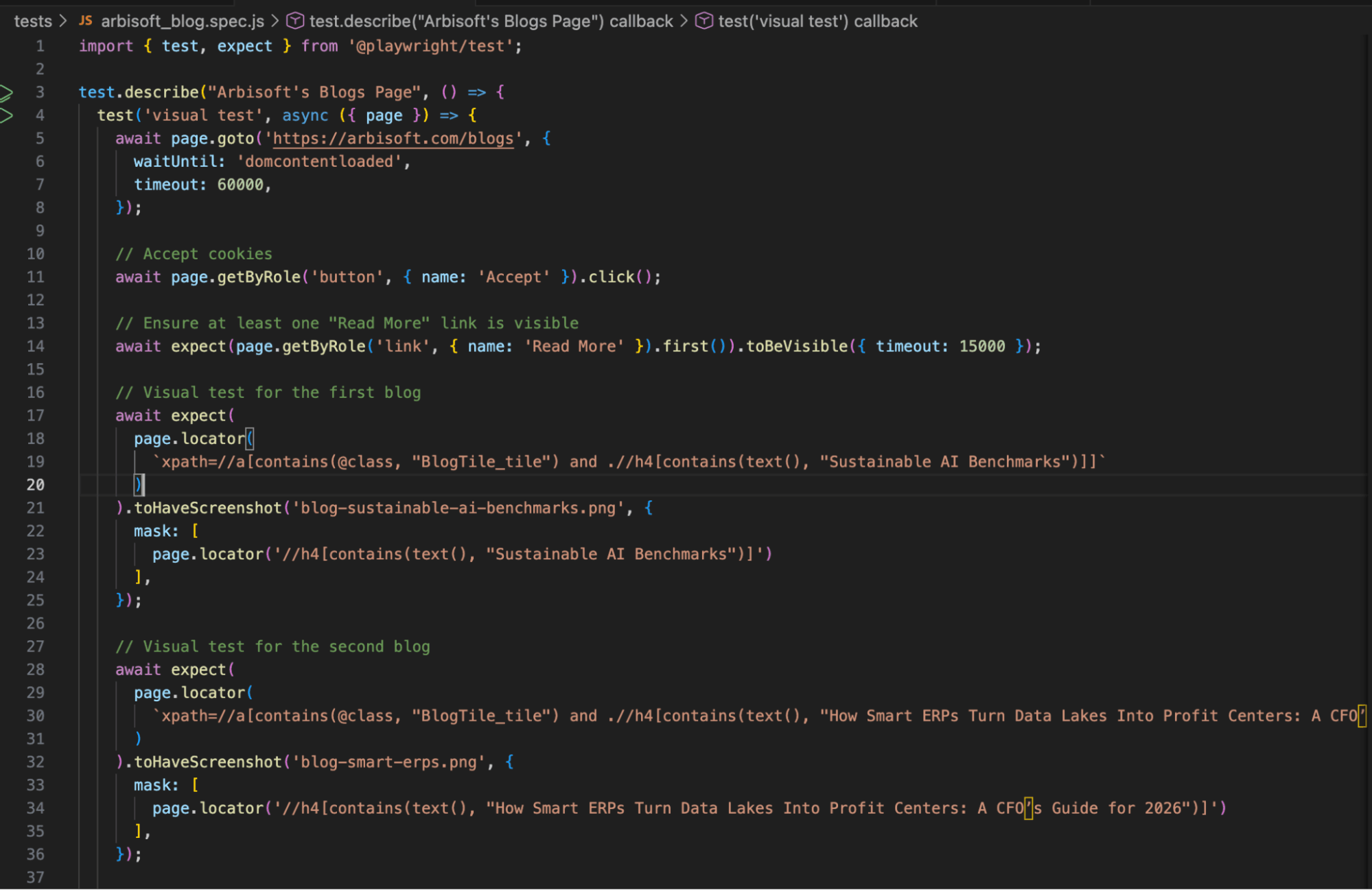 Let’s create a basic visual test for our web application, and I will use the blogs page of arbisoft.com, i.e., https://arbisoft.com/blogs. Below is the test code:
