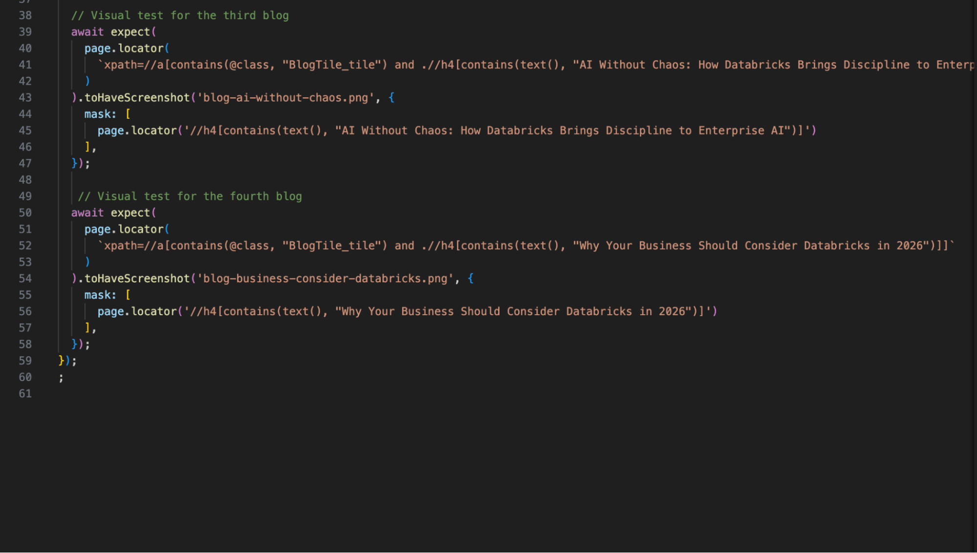 - It is used to mask the dynamic content, e.g., (h4 text in our examples). Because they can break visual tests. Masked content is ignored by the Playwright during comparison.