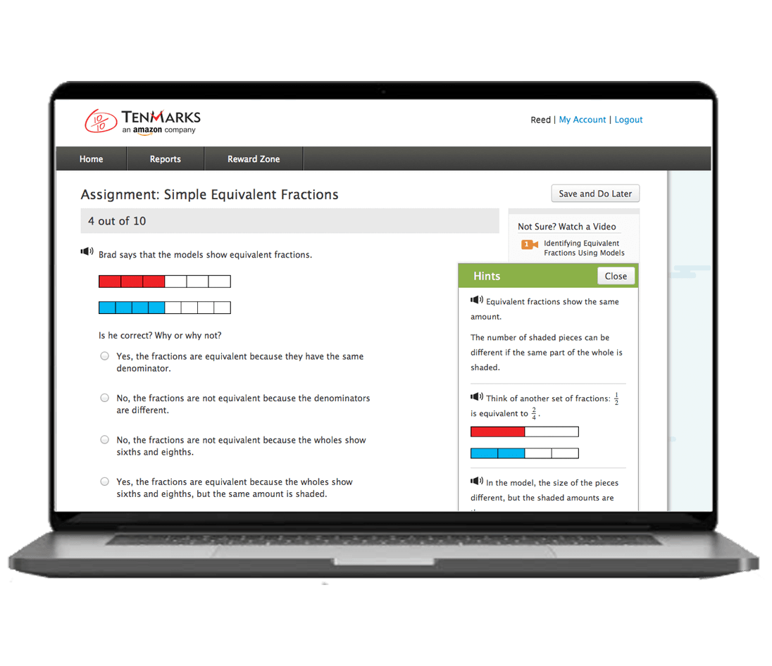 TenMarks, an Amazon company, provided solutions created and led by educators and technologists to personalize online Math practice while aligning it with Common Core and state standards. It provides Math practice and enrichment programs for first through twelfth graders using a structured approach of practice, on-demand hints, video lessons and real-time results. TenMarks Math is used by students in more than 85% of school districts in the U.S.